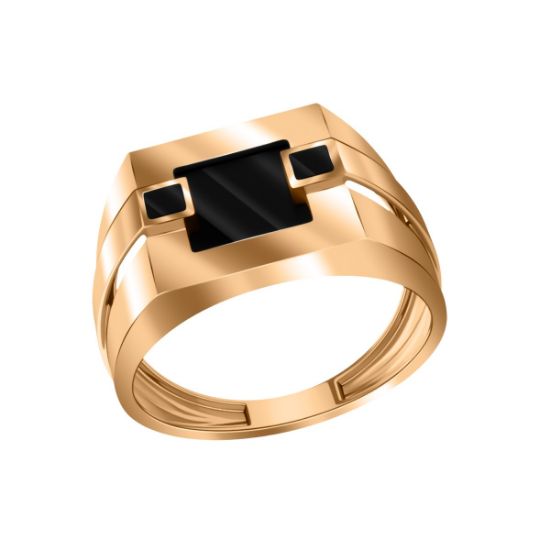 Вставка: крупный прямоугольный оникс в центре, дополненный двумя небольшими вставками по бокам. Тёмный цвет камня создаёт выразительный контраст с тёплым золотом.