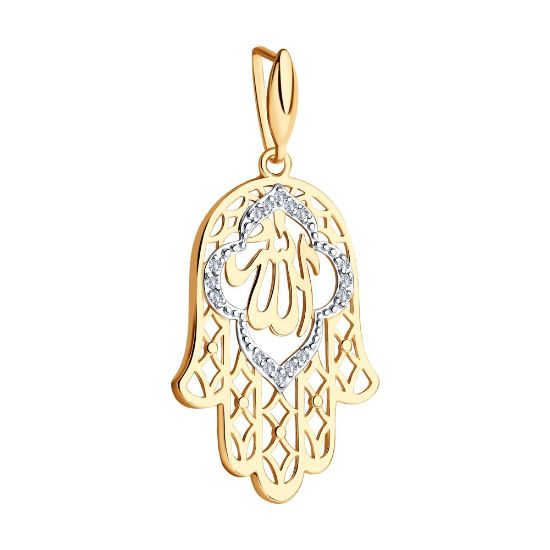 Этот изысканный кулон выполнен из золота 585 пробы и украшен изящной арабской надписью «Аллах», инкрустированной фианитами. Символ «Рука Фатимы» (хамса) традиционно считается мощным оберегом от сглаза и негативной энергии.