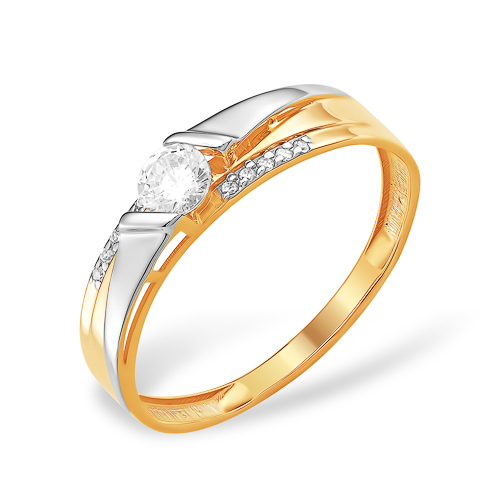 Это изысканное кольцо выполнено из комбинированного золота, сочетающего жёлтое и белое золото. Центральным элементом украшения является крупный круглый камень, предположительно фианит, который придаёт изделию блеск и элегантность. По бокам кольца расположена дорожка из мелких фианитов, подчёркивающая его утончённый дизайн.