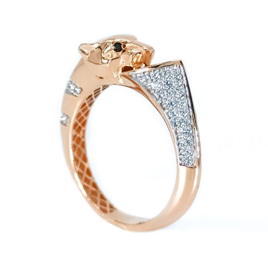 Дизайн: центральный элемент кольца — детально проработанная голова пантеры, символизирующая силу, грацию и независимость. Животное словно «держит» сверкающий элемент кольца, создавая эффектный и запоминающийся образ.