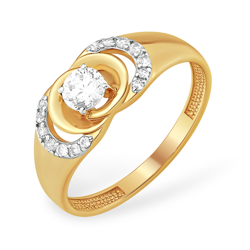 Это кольцо из красного золота 585 пробы с фианитами. Оно выполнено в фантазийном стиле с плавными линиями и изящным дизайном. Центральным элементом украшения является крупный фианит, окружённый двумя кольцами из мелких фианитов. Такое оформление придаёт кольцу элегантность и утончённость.