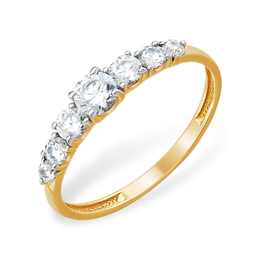 Кольцо выполнено из красного золота 585 пробы, что придаёт ему насыщенный тёплый оттенок и долговечность. Украшение украшено рядом фианитов круглой огранки, которые создают эффектный блеск и подчёркивают элегантность изделия. Центральный камень крупнее боковых, что делает акцент на изысканности дизайна.