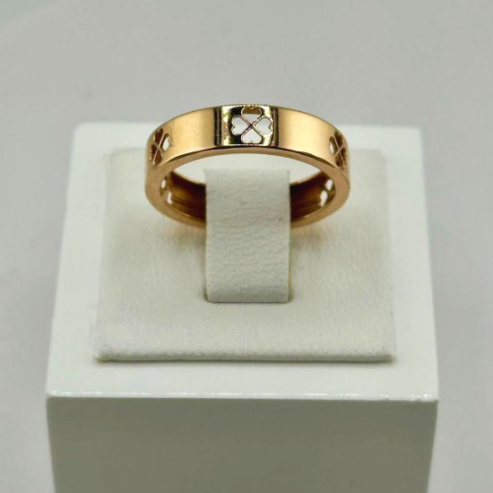 Дизайн: лаконичный, но выразительный. Широкая гладкая лента кольца украшена сквозным узором в виде четырёхлистных клеверов, равномерно распределённых по окружности.