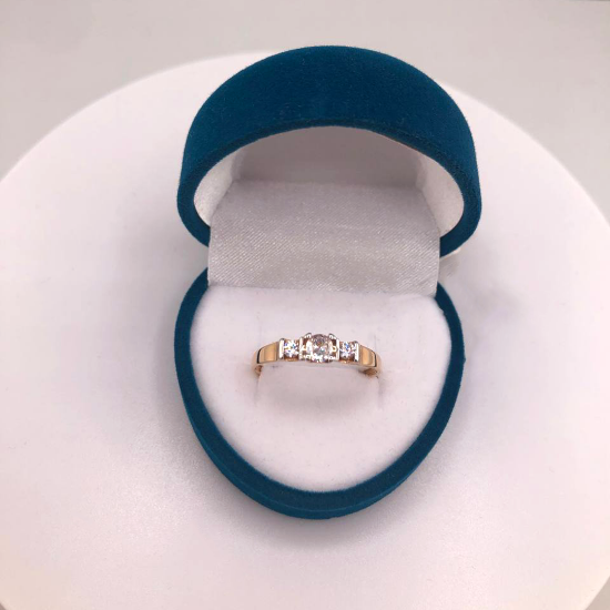 Это изысканное кольцо выполнено из красного золота 585 пробы, что гарантирует его долговечность и благородный блеск. Центральным элементом украшения являются три фианита, расположенные в ряд, которые придают кольцу ослепительное сияние.