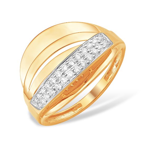 Кольцо выполнено из красного золота 585 пробы. Оно украшено фианитами, которые создают эффектный блеск и подчёркивают изысканность изделия. Дизайн кольца включает две переплетающиеся полосы, одна из которых инкрустирована фианитами, что придаёт украшению современный и элегантный вид.