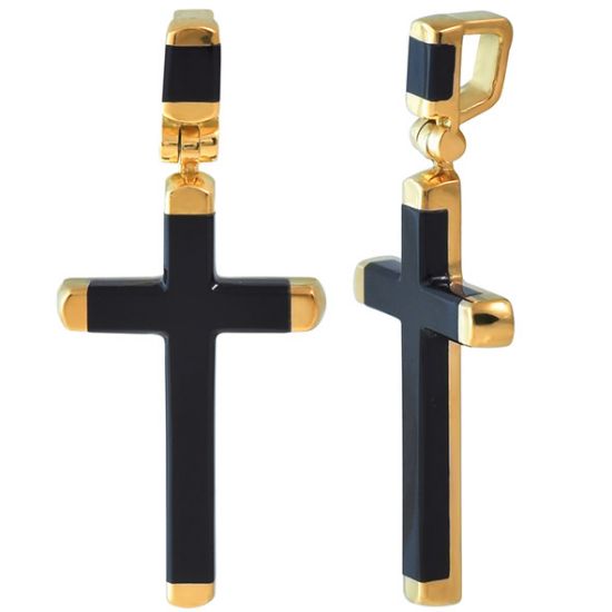 Дизайн: лаконичный, современный. Классическая форма креста дополнена выразительным контрастом чёрного агата и золотых вставок.