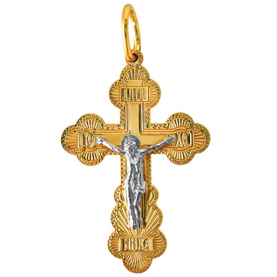 Дизайн: классический православный крест с детализированным изображением Распятия. Фигура Иисуса Христа выполнена в контрастном серебристом тоне, что придаёт изделию особую выразительность.