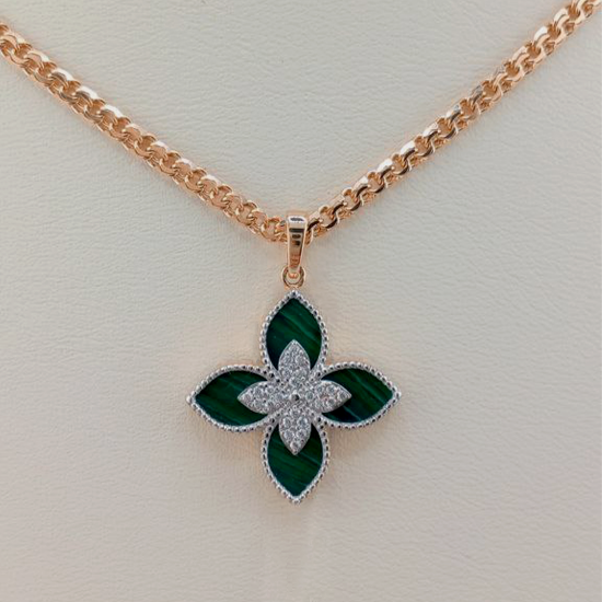 Откройте для себя очарование природы в ювелирном исполнении с этой изысканной подвеской. Элегантный дизайн в форме цветка сочетает глубокий зелёный малахит и блеск фианитов, создавая неповторимый акцент для любого образа.