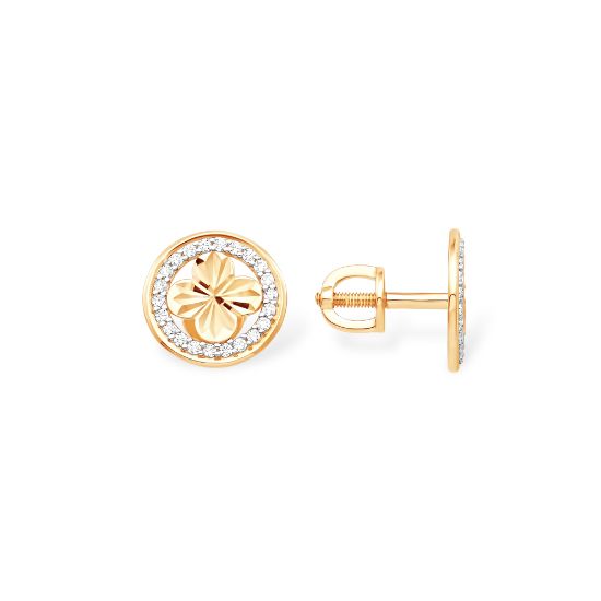 Серьги-пусеты выполнены из красного золота и украшены фианитами, создавая изысканный и утонченный образ. Центральный элемент дизайна — цветок с лепестками, выполненный в виде объемной композиции, окруженной ореолом из мелких фианитов. Этот аксессуар идеально подходит для торжественных мероприятий и подчеркнет элегантность своей обладательницы.