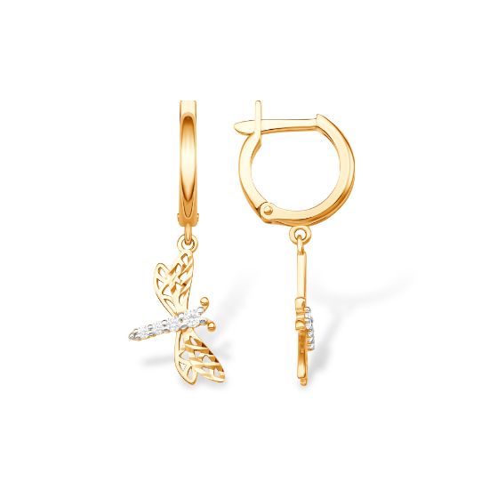 Эти изысканные серьги станут прекрасным дополнением к вашему образу. Они выполнены из золота 585 пробы, что гарантирует их долговечность и благородный вид. Центральным элементом украшения является изящная стрекоза, украшенная фианитами, которые придают серьгам блеск и утонченность.