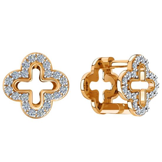 Серьги выполнены из золота, что придает им благородный блеск и долговечность. Их форма напоминает четырехлистный клевер, символизирующий удачу и благополучие. Украшение инкрустировано множеством фианитов, которые создают эффект сияния и подчеркивают изысканность дизайна.