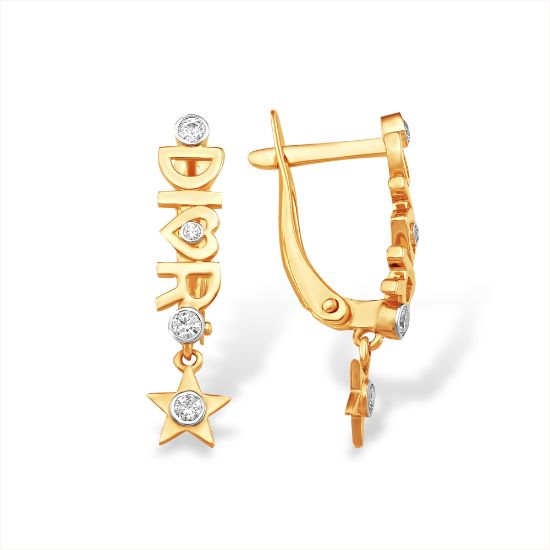 Представляем изысканные серьги из золота, украшенные фианитами, с оригинальным дизайном — сочетание надписи и подвески в виде звезды.