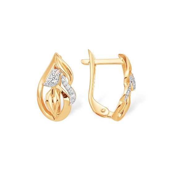 Серьги выполнены из красного золота 585 пробы и украшены изящными вставками из фианитов. Дизайн изделия напоминает плавные линии, создающие ощущение легкости и утонченности.