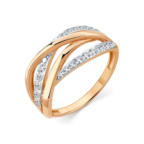 Представляем стильное кольцо из красного золота 585 пробы, украшенное сверкающими фианитами. Это украшение сочетает в себе современный дизайн и безупречное качество — идеальный выбор для тех, кто ценит утончённость в деталях.