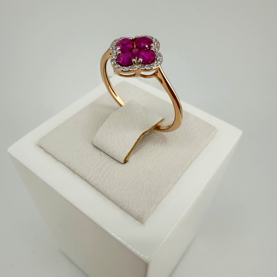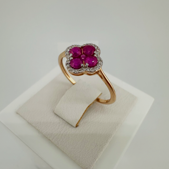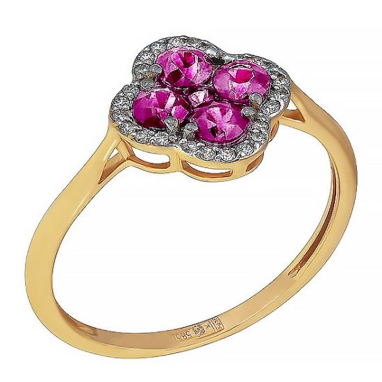 Золотое кольцо 585 пробы с рубинами и бриллиантами: воплощение роскоши и элегантности: 4 рубина (круглые, 3,2 мм), цвет 2, чистота 2 — 0,66 ct; 1 рубин (круглый, 2,0 мм), цвет 2, чистота 2 — 0,04 ct; 24 бриллианта (круглые, 17 граней), цвет 2, чистота 2, огранка А — 0,085 ct.
