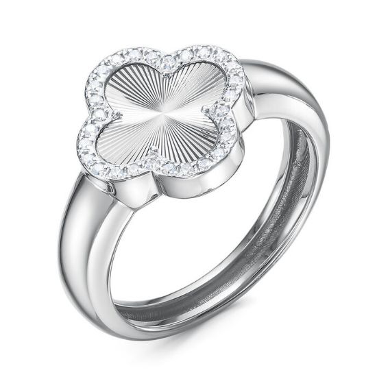 Представляем вам стильное серебряное кольцо в форме клевера, украшенное сверкающими фианитами.