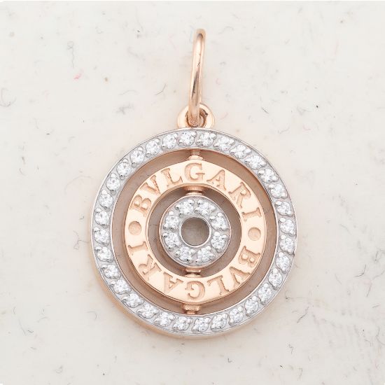 Подвеска выполнена в виде круглого кулона с тремя концентрическими кругами. Внешний круг украшен мелкими прозрачными фианитами, которые создают эффект сияния. Средний круг выполнен из красного золота и содержит гравировку в стиле «Булгари». Внутренний круг также инкрустирован фианитами, что добавляет изделию изысканности.