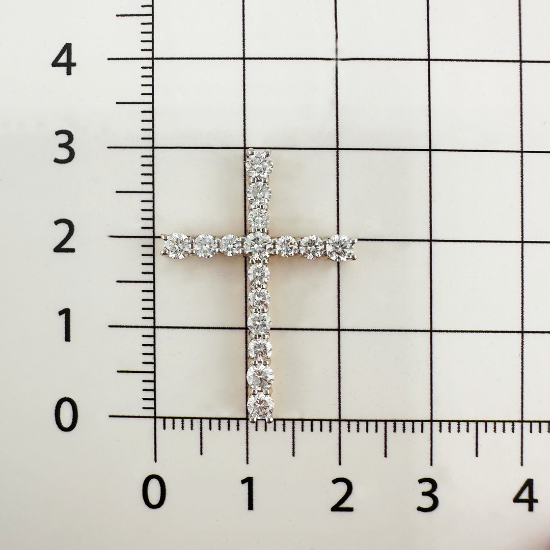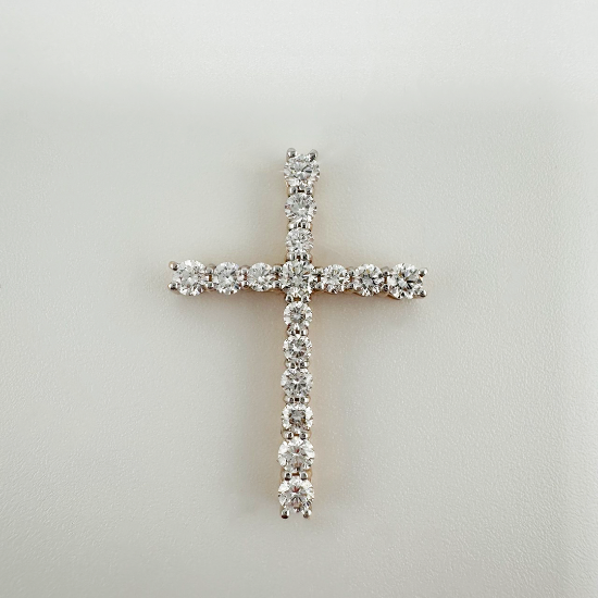 крест украшен множеством круглых бриллиантов, равномерно расположенных по всей длине перекладин и вертикальной части. Камни надёжно закреплены, что гарантирует сохранность украшения на долгие годы.