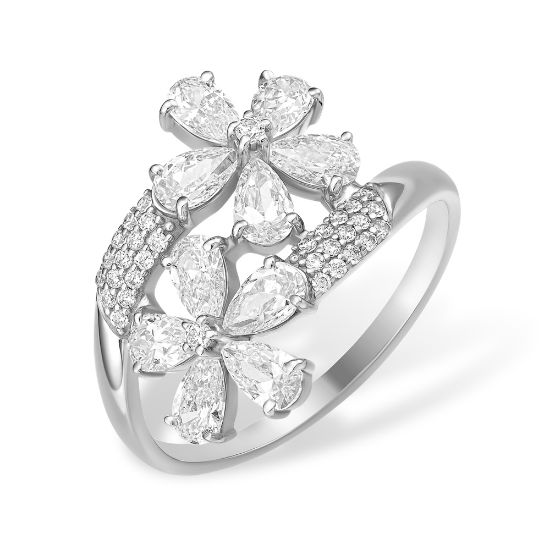 фианиты высшего качества, надёжно закреплённые в оправе. Крупные каплевидные камни формируют лепестки, а россыпь мелких фианитов украшает ободок кольца.