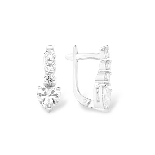 изысканная композиция из нескольких фианитов, выстроенных в вертикальную линию, завершается крупным камнем в форме сердца — акцентная деталь, придающая украшению особый шарм.