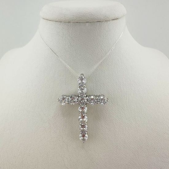 Ювелирный кулон-крест, инкрустированный прозрачными камнями, создаёт эффект сияния. Универсальный аксессуар, который подойдёт как для повседневной носки, так и для торжественных мероприятий.