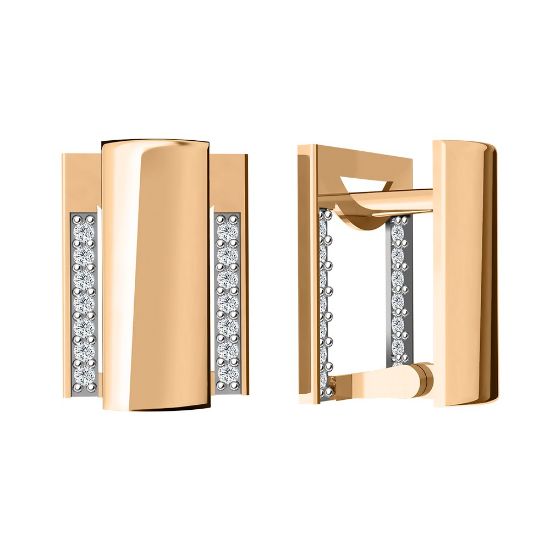 Дизайн: геометрическая форма с плавными линиями и прямоугольными элементами. Центральная часть серьги гладкая, а боковые стороны украшены рядами фианитов.