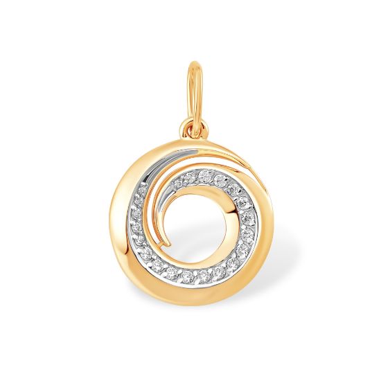 Подвеска из красного золота 585 пробы выполнена в современном стиле. Она имеет круглую форму с изящным спиральным элементом, который добавляет динамики и оригинальности дизайну. Центральная часть подвески украшена россыпью фианитов, которые придают изделию блеск и элегантность.