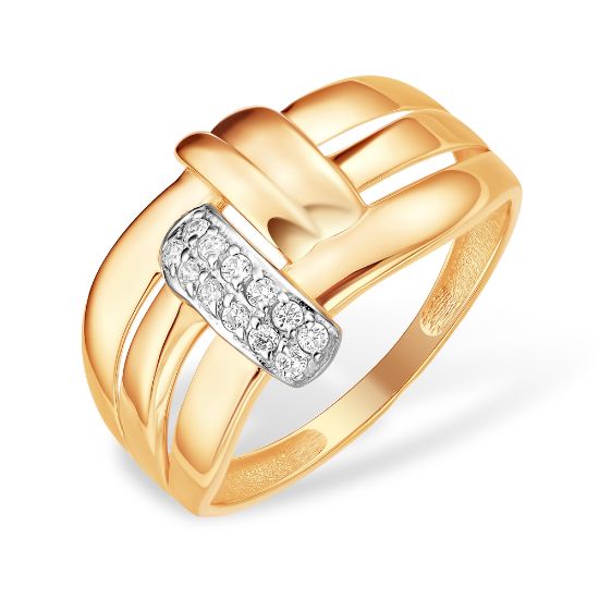 Кольцо выполнено из красного золота 585 пробы. Оно украшено фианитами, которые создают эффектный блеск и подчёркивают изысканность изделия. Дизайн кольца включает две переплетающиеся полосы, одна из которых инкрустирована фианитами, что придаёт украшению современный и элегантный вид.