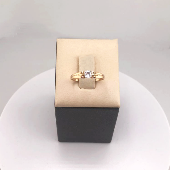 Кольцо выполнено из красного золота 585 пробы. Оно украшено крупным фианитом, который закреплён в изящной оправе. Дизайн кольца отличается плавными линиями и утончённым переплетением, что делает его универсальным украшением для любого случая.