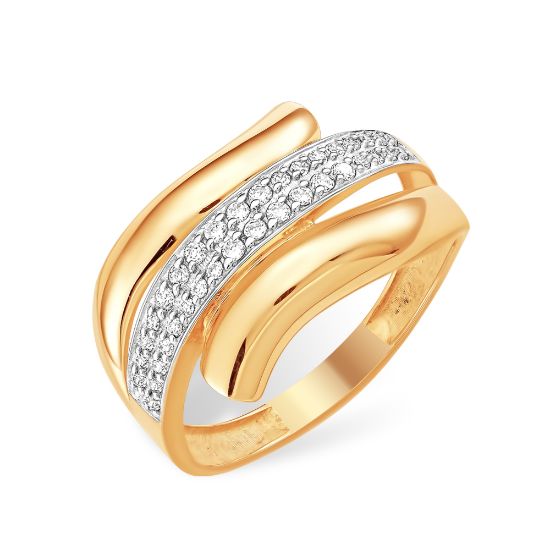 Кольцо выполнено из красного золота 585 пробы и украшено множеством мелких фианитов, которые создают эффектную «дорожку» по всей окружности украшения. Дизайн кольца отличается плавными линиями и переплетением двух полос, что придаёт ему элегантность и утончённость.