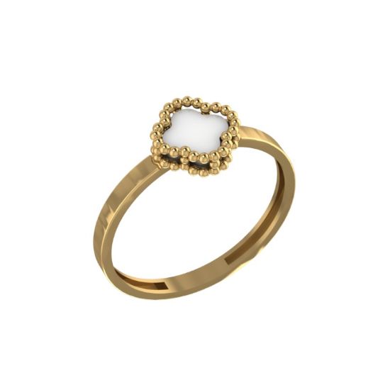 Это изысканное золотое кольцо с перламутром в форме клевера. Оно выполнено из золота, что придаёт ему блеск и долговечность. Центральный элемент кольца — четырёхлистный клевер, украшенный перламутровой вставкой, которая добавляет изделию утончённую игру света и мягкости.