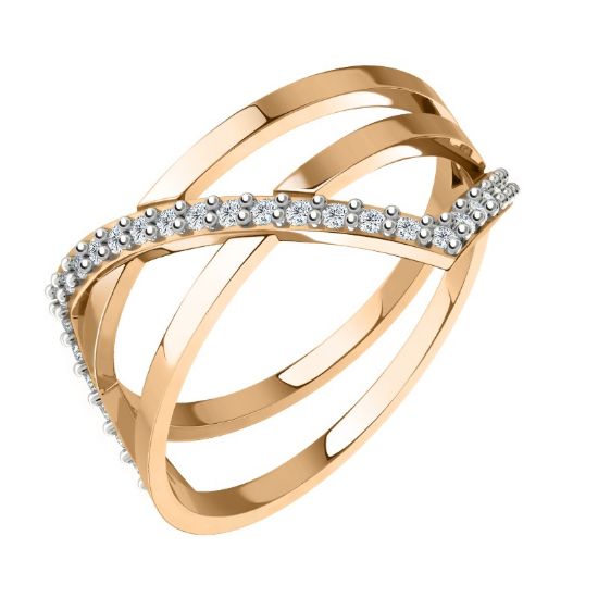 Это изысканное кольцо из красного золота 585 пробы с фианитами — воплощение элегантности и утончённости. Его дизайн выполнен в виде переплетающихся полос, создающих эффектный и современный образ. Центральная часть кольца украшена дорожкой из фианитов, которые придают украшению блеск и изысканность.