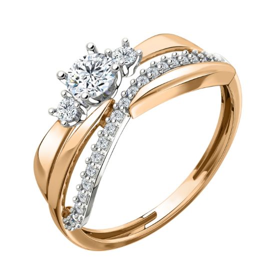 Элегантное кольцо из золота, украшенное в центре фианитами и изящной дорожкой из фианитов, станет идеальным выбором для особых случаев или повседневного ношения.