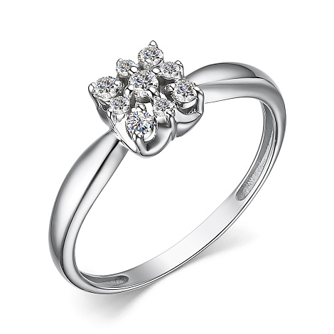 Ювелирное кольцо из белого золота с бриллиантами. Оно украшено несколькими бриллиантами, расположенными в виде цветочного узора. Центральный элемент состоит из шести камней, которые создают эффект сияния и подчеркивают элегантность украшения.